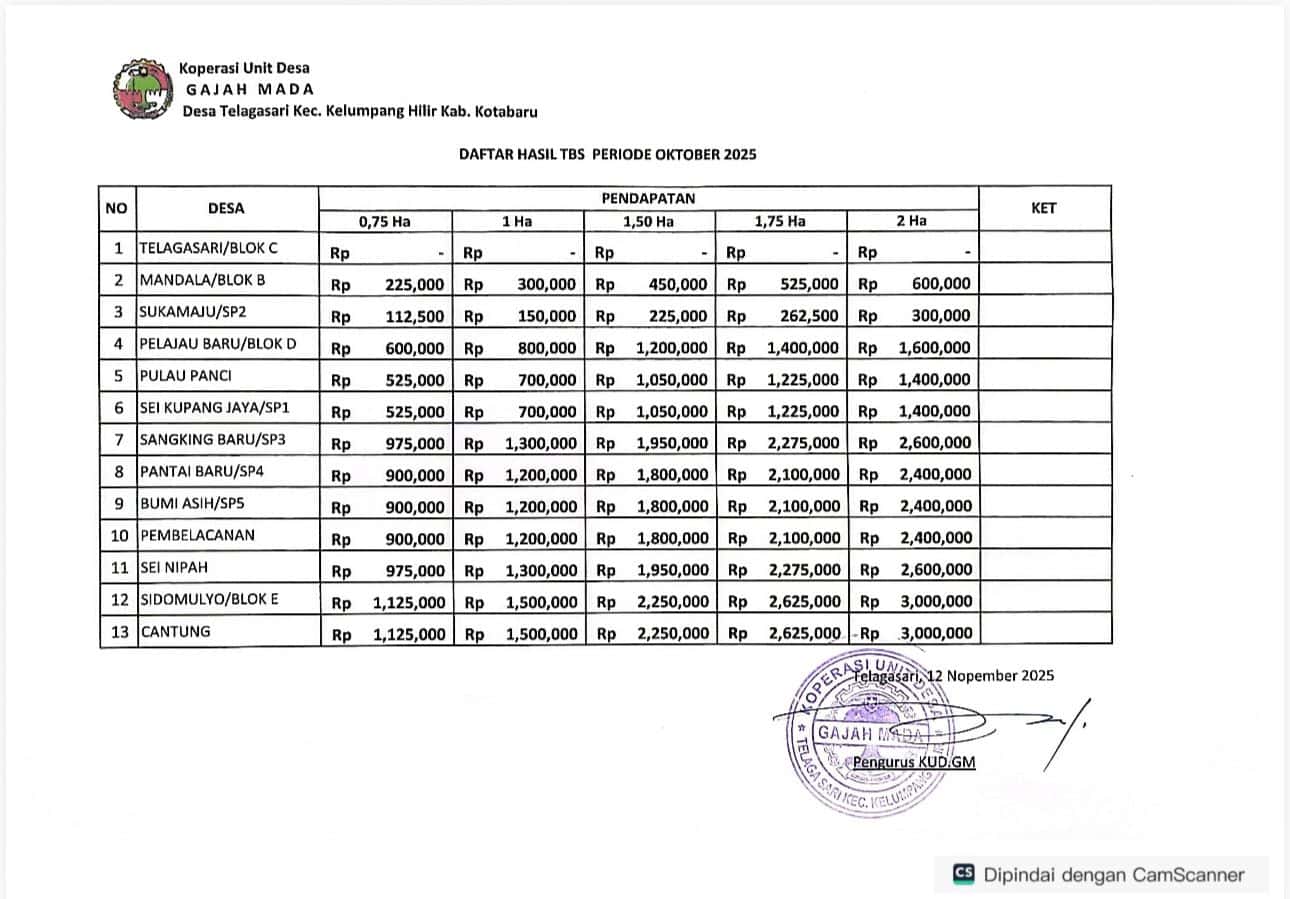 Sebagai bentuk transparansi dan akuntabilitas, Koperasi Unit Desa (KUD) Gajah Mada menyampaikan laporan hasil panen Tandan Buah Segar (TBS) dari seluruh desa mitra untuk periode bulan September 2025. Data ini mencerminkan hasil pengumpulan dari lahan dengan luasan bervariasi, mulai dari 0,75 hektare hingga 2 hektare.