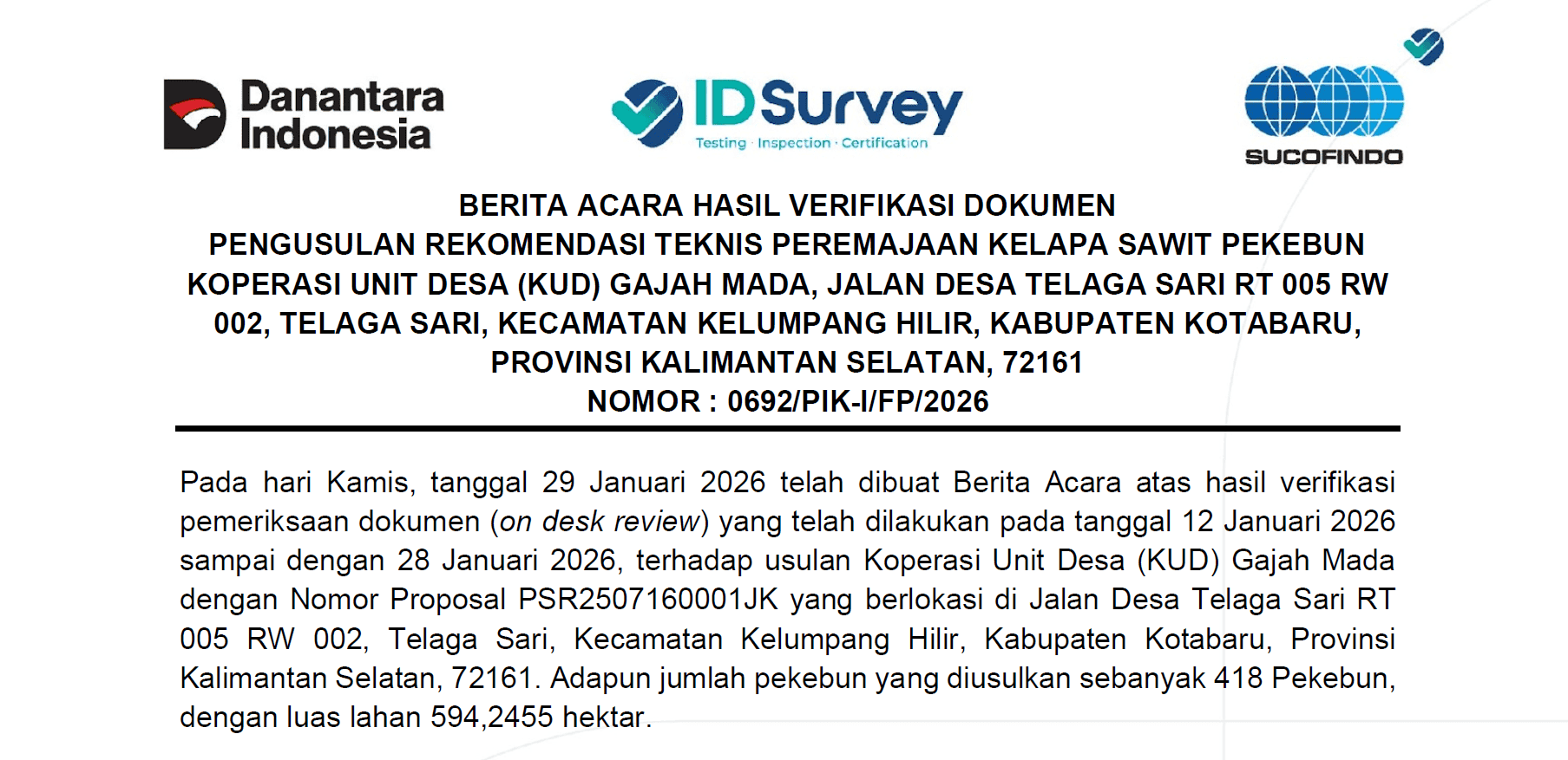 Sehubungan dengan hal tersebut, dimohon kepada seluruh petani plasma yang memiliki lahan di Desa Sidomulyo dan Sungai Kupang untuk mempersiapkan diri dan hadir membawa dokumen Kartu Keluarga (KK) yang masih berlaku dan Kartu Tanda Penduduk (KTP) Asli.